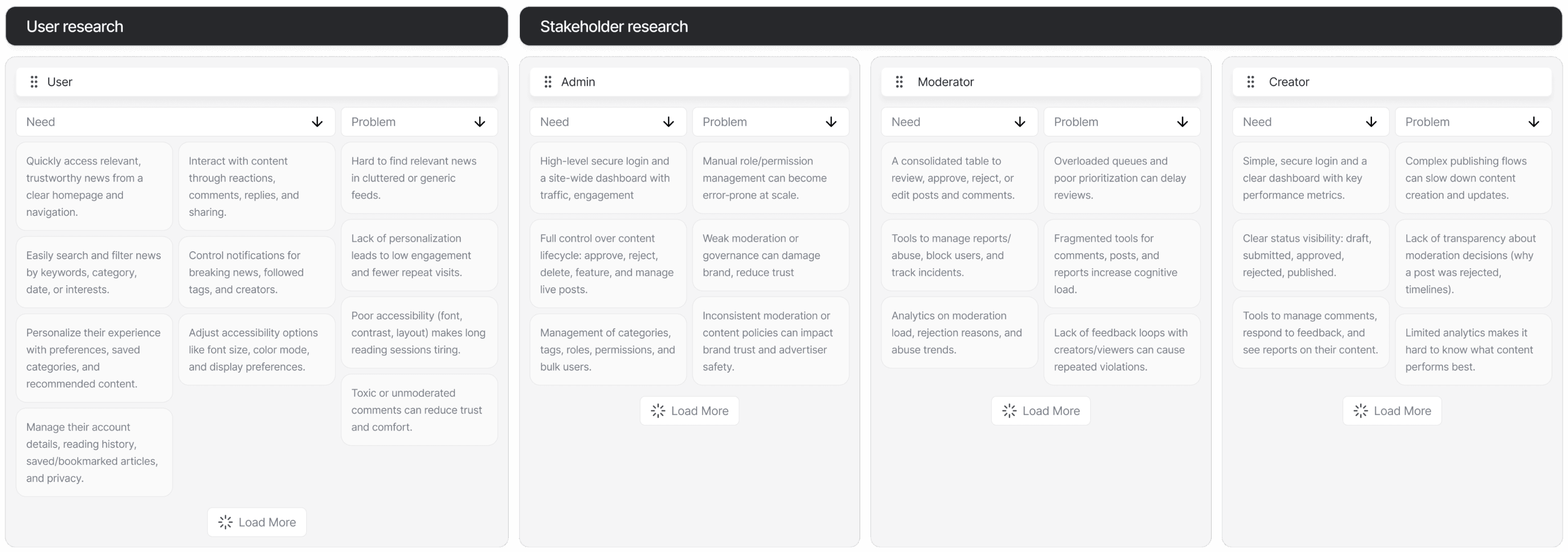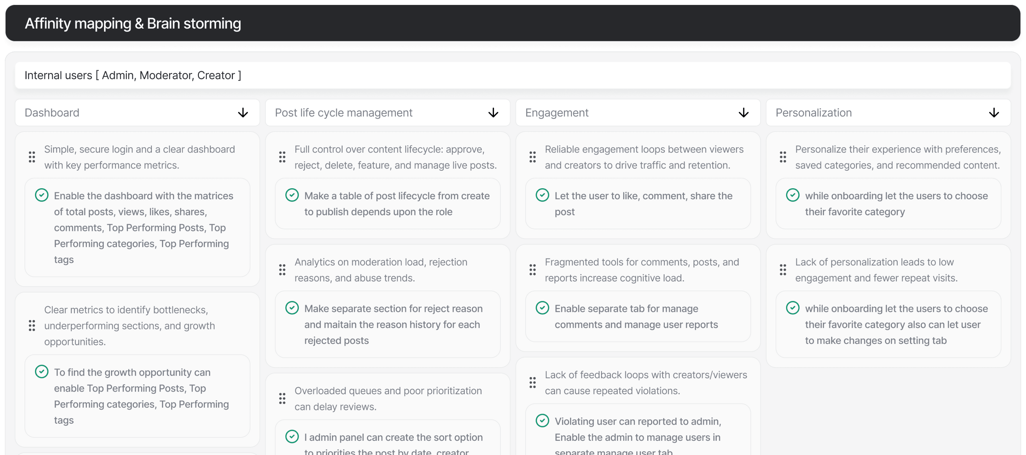For internal roles, I ran a stakeholder interview with the admin (primary stakeholder) through PM to understand current problems, requirements, and priorities for admin, moderator, creator flows and collected all data.