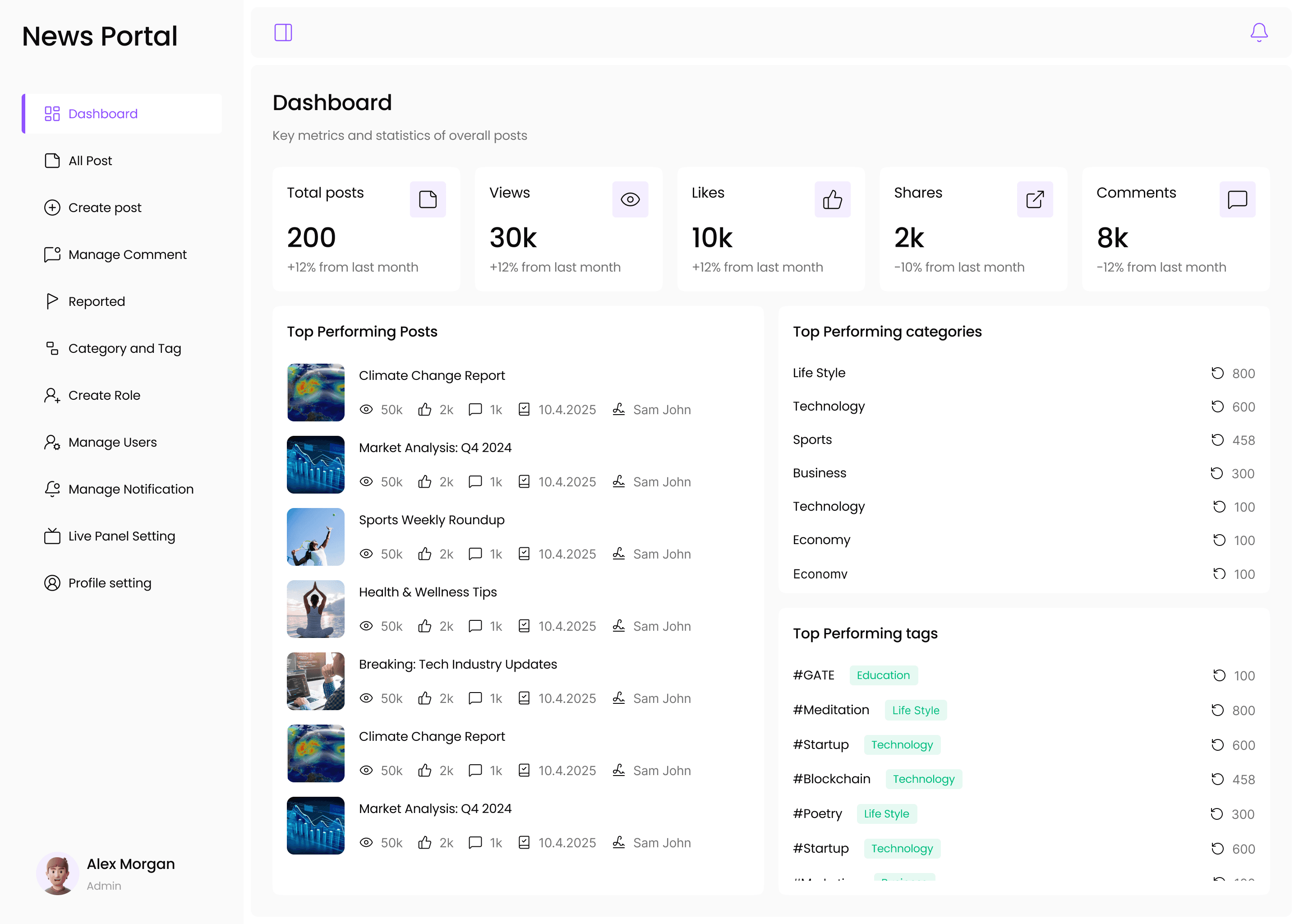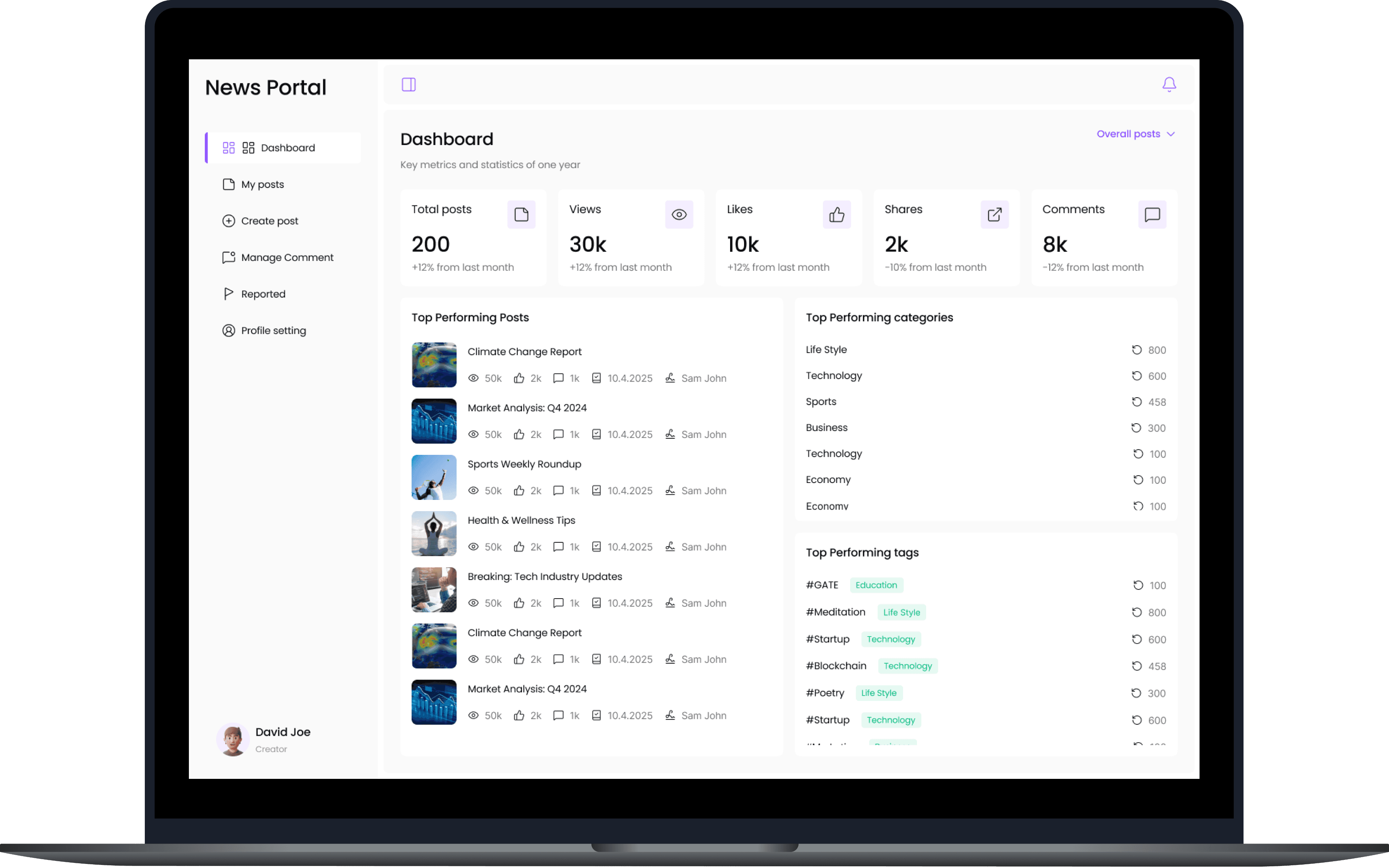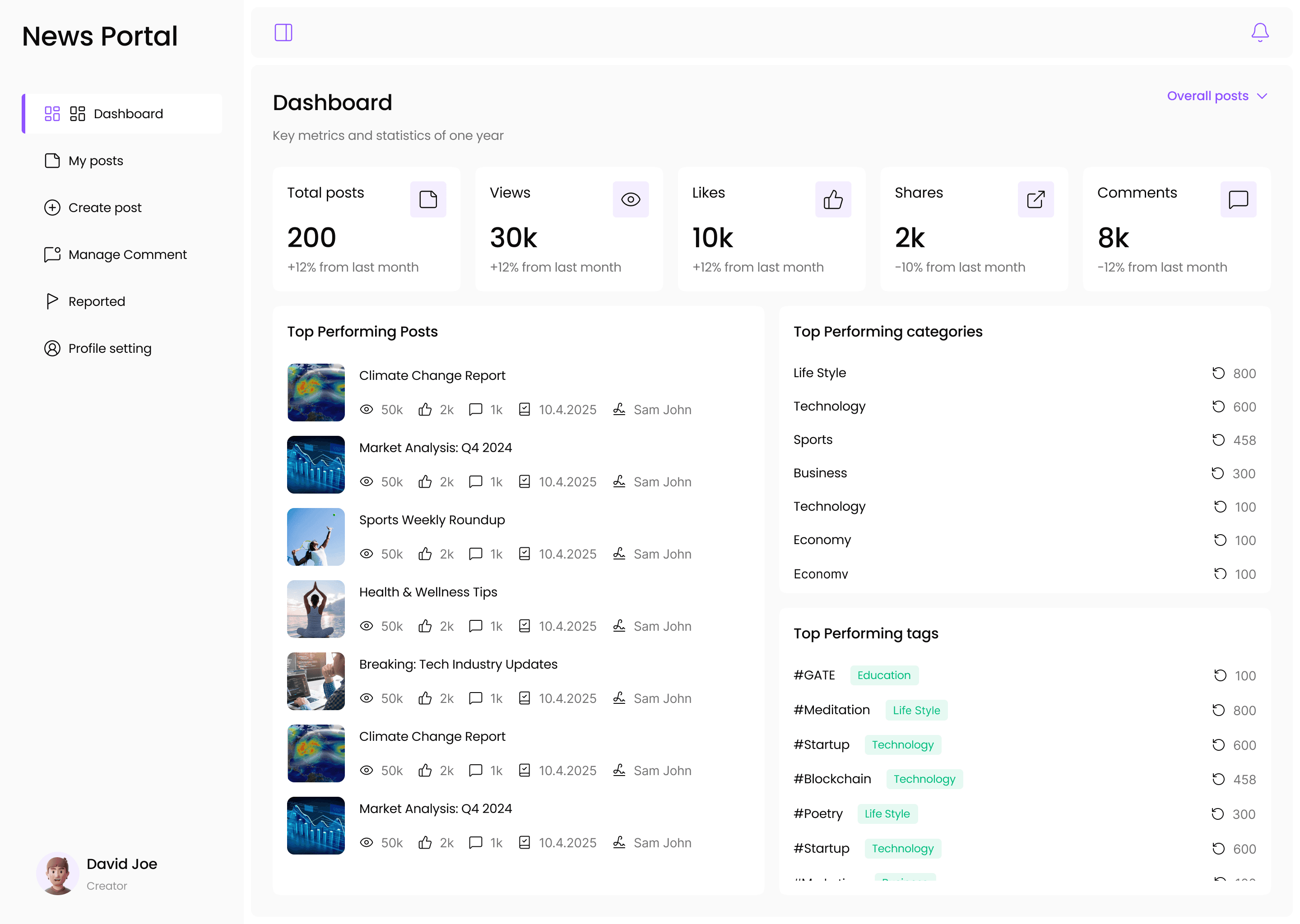 Add Analytics of total posts, views, likes, shares, comments, Top Performing Posts, Top Performing categories, Top Performing tags.